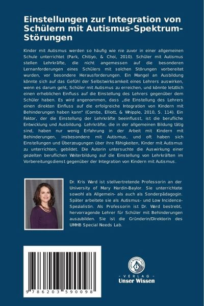 Kinder mit Autismus werden so häufig wie nie zuvor in einer allgemeinen Schule unterrichtet (Park, Chitiyo, & Choi, 2010). Schüler mit Autismus stellen Lehrkräfte, die nicht angemessen auf die besonderen Lernanforderungen eines Schülers mit solchen Störungen vorbereitet wurden, vor besondere Herausforderungen. Ein Mangel an Ausbildung könnte sich auf das Gefühl der Selbstwirksamkeit eines Lehrers auswirken, wenn es darum geht, Schüler mit Autismus zu erreichen, und könnte letztlich einen erheblichen Einfluss auf die Einstellung des Lehrers gegenüber dem Schüler haben. Es wird angenommen, dass "die Einstellung des Lehrers einen direkten Einfluss auf die erfolgreiche Integration von Kindern mit Behinderungen haben kann" (Combs, Elliott, & Whipple, 2010, S. 114). Ein Faktor, der die Einstellung der Lehrkräfte beeinflusst, ist die berufliche Entwicklung und Ausbildung. Lehrkräfte, die in der allgemeinen Bildung tätig sind, haben nur wenig Erfahrung in der Arbeit mit Kindern mit Behinderungen, insbesondere mit Autismus, und oft haben sich Einstellungen und Überzeugungen über ihre Fähigkeiten, Kinder mit Autismus zu unterrichten, gebildet. Die Autorin untersuchte die Auswirkung einer gezielten beruflichen Weiterbildung auf die Einstellung von Lehrkräften im Vorbereitungsdienst gegenüber der Integration von Kindern mit Autismus.