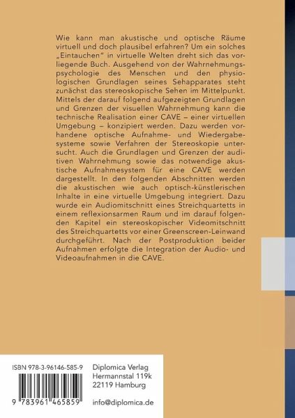 Wie kann man akustische und optische Räume virtuell und doch plausibel erfahren? Um ein solches "Eintauchen" in virtuelle Welten dreht sich die vorliegende Arbeit. Ausgehend von der Wahrnehmungspsychologie des Menschen und den physiologischen Grundlagen seines Sehapparates steht zunächst das stereoskopische Sehen im Mittelpunkt. Mittels der darauf folgend aufgezeigten Grundlagen und Grenzen der visuellen Wahrnehmung kann die technische Realisation einer CAVE - einer virtuellen Umgebung - konzipiert werden. Dazu werden vorhandene optische Aufnahme- und Wiedergabesysteme sowie Verfahren der Stereoskopie untersucht. Auch die Grundlagen und Grenzen der auditiven Wahrnehmung sowie das notwendige akustische Aufnahmesystem für eine CAVE werden dargestellt. In den folgenden Abschnitten werden die akustischen wie auch optisch-künstlerischen Inhalte in eine virtuelle Umgebung integriert. Dazu wurde ein Audiomitschnitt eines Streichquartetts in einem reflexionsarmen Raum und im darauf folgenden Kapitel ein stereoskopischer Videomitschnitt des Streichquartetts vor einer Greenscreen-Leinwand durchgeführt. Nach der Postproduktion beider Aufnahmen erfolgte die Integration der Audio- und Videoaufnahmen in die CAVE.