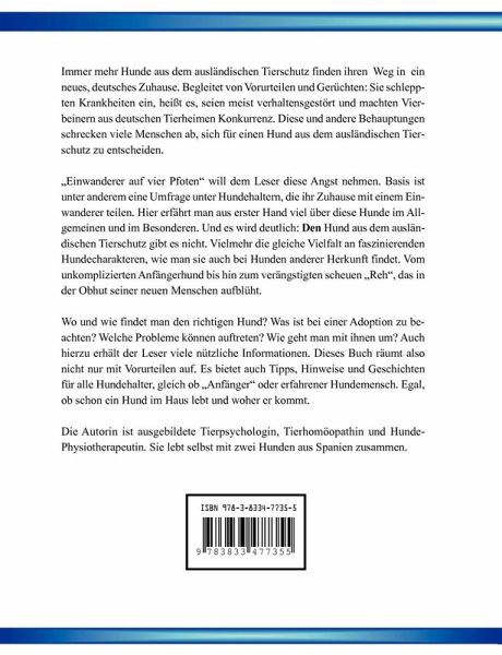 Immer mehr Hunde aus dem ausländischen Tierschutz finden ihren Weg in ein neues, deutsches Zuhause. Begleitet von Vorurteilen: Sie schleppten Krankheiten ein, heißt es, seien meist verhaltensgestört und machten Vierbeinern aus deutschen Tierheimen Konkurrenz. Diese und andere Behauptungen schrecken viele Menschen ab, sich für einen Hund aus dem ausländischen Tierschutz zu entscheiden. "Einwanderer auf vier Pfoten" will dem Leser diese Angst nehmen und aufklären. Basis ist unter anderem eine Umfrage unter Hundehaltern, die ihr Zuhause mit einem "Einwanderer" teilen. Hier erfährt man aus erster Hand viel über diese Hunde im Allgemeinen und im Besonderen. Und es wird deutlich: Den Hund aus dem ausländischen Tierschutz gibt es nicht. Vielmehr die gleiche Vielfalt an faszinierenden Hundecharakteren, wie man sie auch bei Hunden anderer Herkunft findet. Wo und wie findet man den richtigen Hund? Was ist zu beachten? Welche Probleme können auftreten? Wie geht man mit ihnen um? Auch hierzuerhält der Leser nützliche Informationen. Dieses Buch räumt also nicht nur mit Vorurteilen auf. Es bietet Tipps, Hinweise und Geschichten für alle Hundehalter und Interessierten.