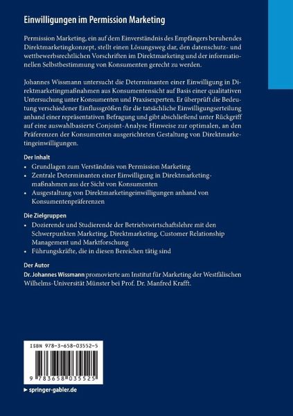 Permission Marketing, ein auf dem Einverständnis des Empfängers beruhendes Direktmarketingkonzept, stellt einen Lösungsweg dar, den datenschutz- und wettbewerbsrechtlichen Vorschriften im Direktmarketing und der informationeller Selbstbestimmung von Konsumenten gerecht zu werden. Johannes Wissmann untersucht die Determinanten einer Einwilligung in Direktmarketingmaßnahmen umfassend aus Konsumentenperspektive. Auf Basis einer breiten Literaturanalyse und einer qualitativen Untersuchung unter Konsumenten und Praxisexperten identifiziert er zunächst potenziell relevante Determinanten von Einwilligungsentscheidungen. Im Anschluss daran überprüft er die Bedeutung verschiedener Einflussgrößen für die tatsächliche Einwilligungserteilung von Konsumenten anhand einer großzahligen, für Deutschland repräsentativen Befragung. Der Autor gibt abschließend unter Rückgriff auf eine auswahlbasierte Conjoint-Analyse Hinweise zur optimalen, an den Präferenzen der Konsumenten ausgerichteten Gestaltung von Direktmarketingeinwilligungen.