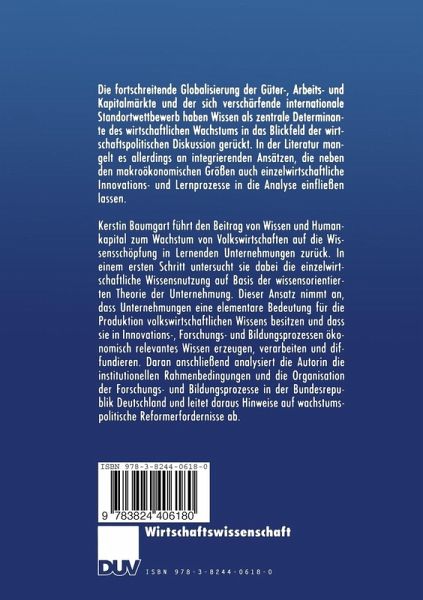 Kerstin Baumgart führt den Beitrag von Wissen und Humankapital zum Wachstum von Volkswirtschaften auf die Wissensschöpfung in Lernenden Unternehmungen zurück. In einem ersten Schritt untersucht sie dabei die einzelwirtschaftliche Wissensnutzung auf Basis der wissensorientierten Theorie der Unternehmung. Dieser Ansatz nimmt an, dass Unternehmungen eine elementare Bedeutung für die Produktion volkswirtschaftlichen Wissens besitzen und dass sie in Innovations-, Forschungs- und Bildungsprozessen ökonomisch relevantes Wissen erzeugen, verarbeiten und diffundieren. Daran anschließend analysiert die Autorin die institutionellen Rahmenbedingungen und die Organisation der Forschungs- und Bildungsprozesse in der Bundesrepublik Deutschland und leitet daraus Hinweise auf wachstumspolitische Reformerfordernisse ab.
