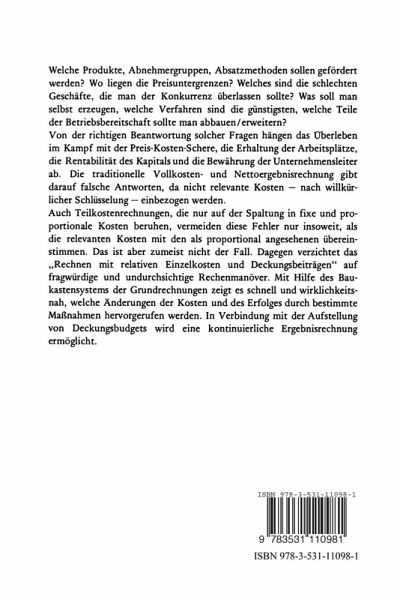 I. Zur Gesamtkonzeption. 1. Die Gestaltung der Kostenrechnung für Zwecke der Betriebskontrolle und Betriebsdisposition. 2. Richtigkeit, Genauigkeit und Wirtschaftlichkeit als Grenzen der Kostenrechnung. 3. Das Rechnen mit Einzelkosten und Deckungsbeiträgen. 4. Die Anwendung des Rechens mit relativen Einzelkosten und Deckungsbeiträgen bei Investitionsentscheidungen. 5. Die Fragwürdigkeit des Verursachungsprinzips im Rechnungswesen. 6. Die Bereitschaftskosten in der entscheidungsorientierten Unternehmerrechnung. 7. Ertragsbildung und Ertragsverbundenheit im Spiegel der Zurechenbarkeit von Erlösen. II. Zur Grundrechnung. 8. Der Aufbau der Grundrechnung im System des Rechnens mit relativen Einzelkosten und Deckungsbeiträgen. 9. Durchführung und Auswertung der Grundrechnung im System des Rechnens mit relativen Einzelkosten und Deckungsbeiträgen. III. Zur Anwendung auf Entscheidungs , Planungs und Kontrollprobleme. 10. Die Deckungsbeitragsrechnung als Instrument der Absatzanalyse. 11. Die Preiskalkulation auf Grundlage von Selbstkosten oder von relativen Einzelkosten und Deckungsbeiträgen. 12. Kurzfristige unternehmerische Entscheidungen im Erzeugungsbereich auf Grundlage des Rechens mit relativen Einzelkosten und Deckungsbeiträgen. 13. Zur Programmplanung bei Kuppelproduktion auf Grundlage der Dekkungsbeitragsrechnung. 14. Periodenbezogene Einzelkosten und Deckungsbeitragsrechnung bei Kuppelproduktion. 15. Systemimmanente und anwendungsbedingte Gefahren von Differenzkosten und Deckungsbeitragsrechnungen. IV. Enzyklopädische Beiträge. 16. Deckungsbeitrag und Deckungsbeitragsrechnung. 17. Zur Deckungsbeitragsrechnung im Handel. V. Zur neueren Entwicklung der Einzelkosten und Deckungsbeitragsrechnung. 18. Überlegungen zur Formulierungeines entscheidungsorientierten Kostenbegriffs. 19. Zum Konzept einer zweckneutralen Grundrechnung. 20. Gestaltungsprobleme einer zweckneutralen Grundrechnung. 21. Deckungsbudgets als Führungsinstrument. 22. Probleme der Festlegung von Deckungsvorgaben aus produktions und absatzwirtschaftlicher Sicht. 23. Kosten und Anpassungsmöglichkeiten im Personalbereich. 24. Grundfragen der Kostenrechnung im Gesundheitswesen und ihre Folgerungen für die Ordnungspolitik. 25. Probleme der entscheidungsorientierten Kosten , Erlös und Deckungsbeitragsrechnung im Güterkraftverkehrsbetrieb. 26. Grenzkosten als Grundlage einer marktorientierten Preispolitik. 27. Ist die Deckungsbeitragsrechnung schuld am Preisverfall?. 28. Von der Kostenrechnung zur Führungsrechnung. VI. Zur Entwicklung des Gesamtkonzepts. 29. Ansätze und Entwicklung des Rechnens mit relativen Einzelkosten und Deckungsbeiträgen. VII. Integration und Dynamisierung des Rechnungswesens. 30. Überlegungen zur Integration von Unternehmensplanung und Unternehmensrechnung. 31. Dynamische versus statische Betrachtungsweise im Rechnungswesen. 32. Sequentielle Entscheidungen in Planungs und Kontrollrechnungen. 33. Probleme der Abbildung zeitlicher Strukturen im Rechnungswesen. 34. Wirtschaftsdynamik, Unternehmensführung und Unternehmensrechnung. VIII. Glossarium spezifischer Grundbegriffe der Deckungsbeitragsrechnung. IX. Abkürzungsverzeichnis. X. Kleine Bibliographie zur Deckungsbeitragsrechnung und verwandten Systemen. XI. Stichwortverzeichnis. XII. Namensverzeichnis.