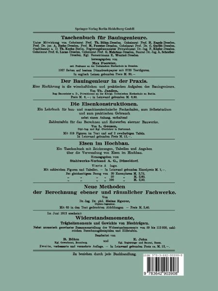 Allgemeiner Teil.- Bauliche Ausbildung der eisernen Eisenbahnbrücken.- Querschnittsbestimmung der einzelnen Konstruktionsteile.- Beispiele.- Statische Berechnung für eine eingleisige Eisenbahnbrücke von 6,60 m Stützweite mit unbeschränkter Bauhöhe.- Statische Berechnung für eine eingleisige Eisenbahnbrücke von 12,0 m Stützweite und unbeschränkter Bauhöhe.- Statische Berechnung für eine eingleisige eiserne Eisenbahnbrücke von 15,0 m Stützweite.- Statische Berechnung für eine eingleisige eiserne Fachwerkbrücke von 24,0 m Stützweite.- Statische Berechnung für eine eingleisige eiserne Eisenbahnbrücke mit oben liegender Fahrbahn von 39,60 m Stützweite.- Statische Berechnung für eine eingleisige eiserne Eisenbahnbrücke von 46,20 m Stützweite.