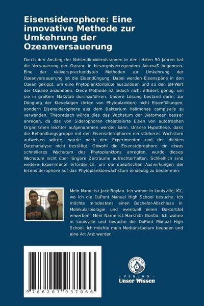 Durch den Anstieg der Kohlendioxidemissionen in den letzten 50 Jahren hat die Versauerung der Ozeane in besorgniserregendem Ausmaß begonnen. Eine der vielversprechendsten Methoden zur Umkehrung der Ozeanversauerung ist die Eisendüngung. Dabei werden Eisenspäne in den Ozean gekippt, um eine Phytoplanktonblüte auszulösen und so den pH-Wert der Ozeane anzuheben. Diese Methode ist jedoch nicht effizient genug, um sie in großem Maßstab durchzuführen. Unsere Lösung bestand darin, zur Düngung der Kieselalgen (Arten von Phytoplankton) nicht Eisenfüllungen, sondern Eisensiderophore aus dem Bakterium Halimonas campisalis zu verwenden. Theoretisch würde dies das Wachstum der Diatomeen besser anregen, da das von Siderophoren chelatisierte Eisen von autotrophen Organismen leichter aufgenommen werden kann. Unsere Hypothese, dass die Behandlungsgruppe mit den Eisensiderophoren ein stärkeres Wachstum aufweisen würde, wurde nach den Experimenten und der dichten Datenanalyse nicht bestätigt. Obwohl die Eisensiderophore ein etwas schnelleres Wachstum des Phytoplanktons anregten, wurde dieses Wachstum nicht über längere Zeiträume aufrechterhalten. Schließlich sind weitere Experimente erforderlich, um die spezifischen Auswirkungen der Eisensiderophore auf das Phytoplanktonwachstum eindeutig zu bestimmen.