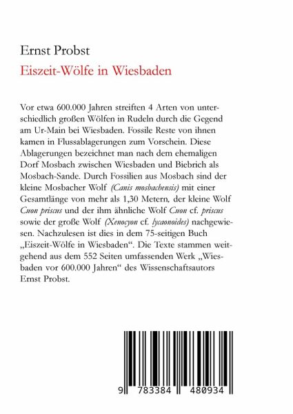 Vor etwa 600.000 Jahren streiften 4 Arten von unterschiedlich großen Wölfen in Rudeln durch die Gegend am Ur-Main bei Wiesbaden. Fossile Reste von ihnen kamen in Flussablagerungen zum Vorschein. Diese Ablagerungen bezeichnet man nach dem ehemaligen Dorf Mosbach zwischen Wiesbaden und Biebrich als Mosbach-Sande. Durch Fossilien aus Mosbach sind der kleine Mosbacher Wolf (Canis mosbachensis) mit einer Gesamtlänge von mehr als 1,30 Metern, der kleine Wolf Cuon priscus und der ihm ähnliche Wolf Cuon cf. priscus sowie der große Wolf (Xenocyon cf. lycaonoides) nachgewiesen. Nachzulesen ist dies in dem 75-seitigen Buch "Eiszeit-Wölfe in Wiesbaden". Die Texte stammen weitgehend aus dem 552 Seiten umfassenden Werk "Wiesbaden vor 600.000 Jahren" des Wissenschaftsautors Ernst Probst.