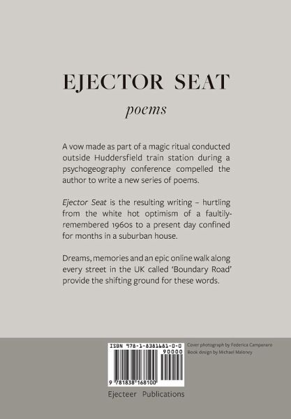 A vow made as part of a magic ritual conducted outside Huddersfield train station during a psychogeography conference compelled the author to write a new series of poems. Ejector Seat is the resulting writing - hurtling from the white hot optimism of a faultily-remembered 1960s to a present day confined for months in a suburban house. Dreams, memories and an epic online walk along every street in the UK called 'Boundary Road' provide the shifting ground for these words. ¿¿Roy Bayfield's previous publications include Desire Paths: Real Walks to Unreal Places (Triarchy Press 2016), Performance Cleaner (Triarchy Press 2019) and poetry assemblage Bypass Pilgrim (TransGenre 2011). His poetry has appeared in STRIDE, Neon Highway, Star*Line and The Passionate Transitory, short fiction in BritPulp! and Chills and a chapter in Walking Inside Out: Contemporary British Psychogeography. He lives in Ormskirk in the North West of England.
