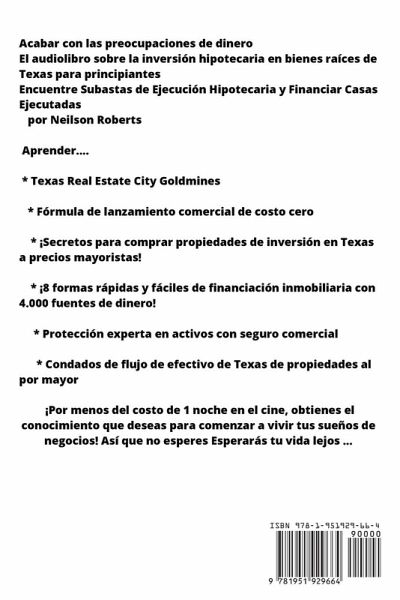 Acabar con las preocupaciones de dinero El audiolibro sobre la inversión hipotecaria en bienes raíces de Texas para principiantes Encuentre Subastas de Ejecución Hipotecaria y Financiar Casas Ejecutadas por Neilson Roberts Aprender.... * Texas Real Estate City Goldmines * Fórmula de lanzamiento comercial de costo cero * ¡Secretos para comprar propiedades de inversión en Texas a precios mayoristas! * ¡8 formas rápidas y fáciles de financiación inmobiliaria con 4.000 fuentes de dinero! * Protección experta en activos con seguro comercial * Condados de flujo de efectivo de Texas de propiedades al por mayor ¡Por menos del costo de 1 noche en el cine, obtienes el conocimiento que deseas para comenzar a vivir tus sueños de negocios! Así que no esperes Esperarás tu vida lejos ...