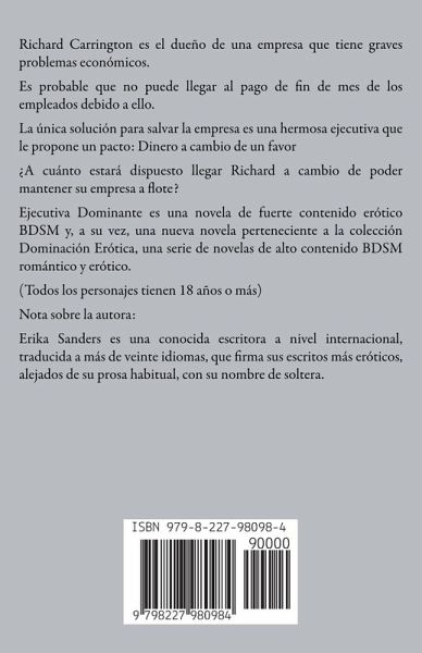 Richard Carrington es el dueño de una empresa que tiene graves problemas económicos. Es probable que no puede llegar al pago de fin de mes de los empleados debido a ello. La única solución para salvar la empresa es una hermosa ejecutiva que le propone un pacto: Dinero a cambio de un favor ¿A cuánto estará dispuesto llegar Richard a cambio de poder mantener su empresa a flote? Ejecutiva Dominante es una novela de fuerte contenido erótico BDSM y, a su vez, una nueva novela perteneciente a la colección Dominación Erótica, una serie de novelas de alto contenido BDSM romántico y erótico. (Todos los personajes tienen 18 años o más) Nota sobre la autora: Erika Sanders es una conocida escritora a nivel internacional, traducida a más de veinte idiomas, que firma sus escritos más eróticos, alejados de su prosa habitual, con su nombre de soltera.