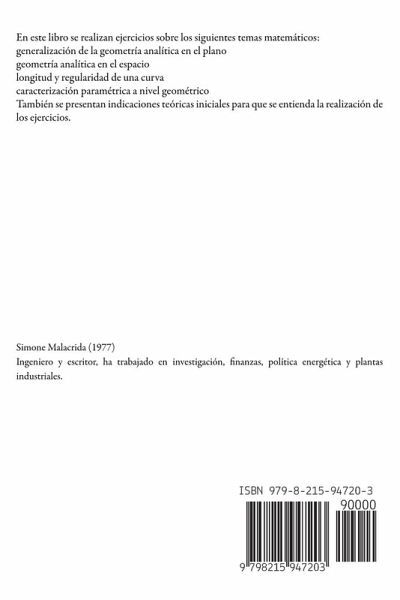 En este libro se realizan ejercicios sobre los siguientes temas matemáticos: generalización de la geometría analítica en el plano geometría analítica en el espacio longitud y regularidad de una curva caracterización paramétrica a nivel geométrico También se presentan indicaciones teóricas iniciales para que se entienda la realización de los ejercicios.