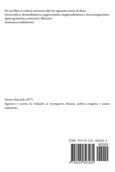 En este libro se realizan ejercicios sobre los siguientes temas de física: electrostática, electrodinámica, magnetostática, magnetodinámica y electromagnetismo óptica geométrica, matricial y difractiva fenómenos ondulatorios