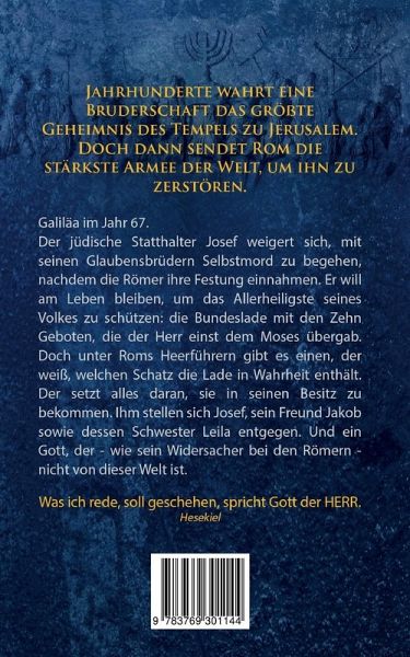 Galiläa im Jahr 67. Der jüdische Statthalter Josef weigert sich, mit seinen Glaubensbrüdern Selbstmord zu begehen, nachdem die Römer ihre Festung einnahmen. Er will am Leben bleiben, um das Allerheiligste seines Volkes zu schützen: die Bundeslade mit den Zehn Geboten, die der Herr einst dem Moses übergab. Doch unter Roms Heerführern gibt es einen, der weiß, welchen Schatz die Lade in Wahrheit enthält. Der setzt alles daran, sie in seinen Besitz zu bekommen. Ihm stellen sich Josef, sein Freund Jakob sowie dessen Schwester Leila entgegen. Und ein Gott, der - wie sein Widersacher bei den Römern - nicht von dieser Welt ist. In seiner Historical Fiction erzählt Holger Haase das Leben des berühmten jüdischen Geschichtsschreibers Flavius Josephus, der einst Priester von königlichem Geblüt war, zum Statthalter und Heerführer Galiläas ernannt wurde, nach seiner Gefangennahme durch die Römer die Seiten wechselte und als Berater des späteren Kaisers Titus den Untergang seiner Heimatstadt Jerusalem und die Zerstörung ihres einzigartigen Tempels mit ansehen musste. Den Juden galt er als Verräter, die Römer hielten ihn für einen Spion. Und niemand von ihnen ahnte, dass er im Auftrag einer höheren Macht handelte.