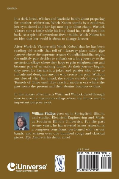 In a dark forest, Witches and Warlocks bandy about preparing for another celebration. Witch Nobeu stands by a cauldron, her eyes closed and her lips moving in silent chant. Warlock Victore stirs a kettle while his long blond hair trails down his back. As a spirit of mysterious fervor builds, Witch Nobeu has no idea that her world is about to change forever. After Warlock Victore tells Witch Nobeu that he has been reading old scrolls that tell of a faraway place called Ejje Amore where the supreme creator GodAllahBuddha reigns, the unlikely pair decides to embark on a long journey to the mysterious village where they hope to gain enlightenment and become part of an exciting future. As their journey begins, they meet Le Patriarch, a joker and partier who loves to ridicule and denigrate anyone who crosses his path. Without any clue of what lies ahead, the couple travels through the Tunnels of Time until they reach a modern era where the past meets the present and their destiny becomes evident. In this fantasy adventure, a Witch and Warlock travel through time to reach a mysterious village where the future and an important purpose await.
