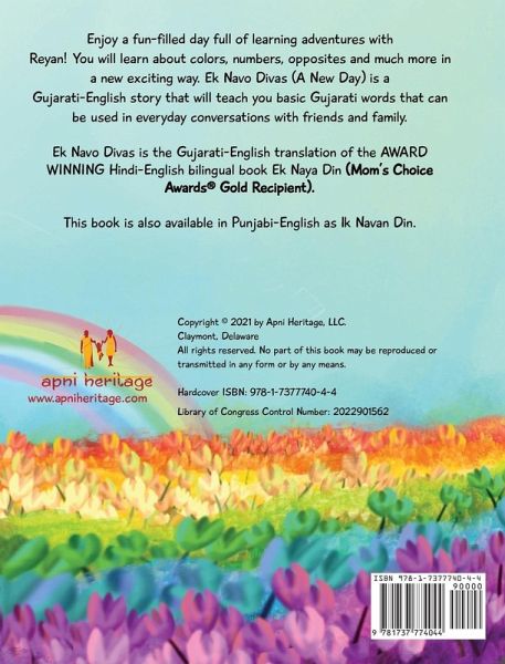 Ek Navo Divas (A New Day) is the Gujarati-English bilingual edition of the AWARD WINNING Hindi-English book Ek Naya Din. Ek Navo Divas is a book about a fun-filled day full of new possibilities that will take you and your little one on a learning adventure. Children will learn about colors, numbers, opposites in an exciting way. A Bilingual/Multilingual book with phonetic and English translation will help young children develop basic conversational skills in both Gujarati and English. This book will help learners of all ages grasp basic Gujarati words used in everyday conversations. Get this book today to incorporate conversational Gujarati into your loved one's life! Visit the website www.apniheritage.com for more details and information about other bilingual products.