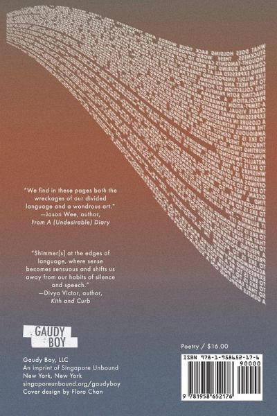 "Shimmer[s] at the edges of language, where sense becomes sensuous and shifts us away from our habits of silence and speech." -Divya Victor, author of Kith and Curb "Exquisite, tantalising construction." -Shubigi Rao, author, Pulp III: An Intimate Inventory of the Banished Book, and winner, Singapore Literature Prize 2024 A visual enactment of attempts at articulating, Eke is the at-tempt-ation towards meaning. What does the feeling of holding your words and thoughts back-stuck and struck in a state of percolation, a plasma state of signification-feel like? What does it look like for ambivalence and divergence to converge during the moment of articulation, when all word-opportunities collide at once, like wildly unspooling threads, like heavy raindrops on a glass surface racing from one fork to the next? A collection of visual aberrations that fumble and stammer, and that concede that a closure in expression can never be achieved, the poems of Eke ache towards both painful and opportune expression.