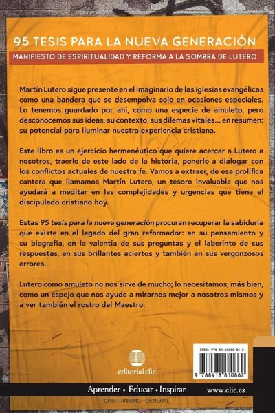 A trav¿¿s de 95 ensayos pol¿¿micos y desafiantes, el autor argentino presenta a Mart¿¿n Lutero en este lado de la historia y lo expone a los dilemas actuales de la fe cristiana. Para muchas iglesias, Lutero y la Reforma son como parientes lejanos que se conocen poco y se recuerdan solo en ocasiones especiales. Incluso podr¿¿amos preguntar: ¿¿qü¿ tiene que ver con nosotros? Con tantos cambios y desaf¿¿os que enfrentamos como cristianos hoy, ¿¿deber¿¿amos tomarnos el tiempo para hablar de un monje alem¿¿n que vivi¿¿ en el siglo XVI? En este manifiesto de espiritualidad y reforma, Lutero no es un objeto de estudio, sino un interlocutor. Lucas Magnin se pregunta por el presente y el futuro del cristianismo y lo hace mirando al pasado: en un di¿¿logo fecundo con la teolog¿¿a, el contexto hist¿¿rico y la biograf¿¿a del gran reformador. Este es un libro para los creyentes y las iglesias que siguen buscando el reino de Dios y su justicia en pleno siglo XXI, al igual que lo hizo la Reforma en el siglo XVI. Cada una de las 95 tesis para la nueva generaci¿¿n identifica un conflicto o una pregunta y lanza un desaf¿¿o a quienes tienen ö¿dos para ö¿r y est¿¿n dispuestos a hacerse cargo del reto.