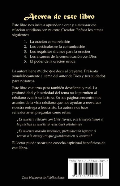 Este libro nos insta a aprender a orar y a atesorar esa relación cotidiana con nuestro Creador. Enfoca los temas siguientes: la oración como relación, los obstáculos en la comunicación, los requisitos divinos para la oración, los alcances de la comunicación con Dios, el poder de la oración unida. La autora tiene mucho que decir al creyente. Presenta simultáneamente el tema del amor de Dios y sus cuidados para nosotros. Este libro es tierno pero también desafiante y real. La profundidad y la seriedad del tema no le permiten al cristiano evadir su lectura. En sus páginas encontramos asuntos de la vida cristiana que nos ayudan a reevaluar nuestra entrega a Jesucristo. La autora nos hace reflexionar en preguntas como estas: ¿Es nuestra relación con Dios teórica, o la transportamos a la práctica en nuestras relaciones cotidianas? ¿Es nuestra oración mecánica, pretendiendo ignorar el rencor o la amargura que guardamos en el corazón? El lector puede sacar una cosecha espiritual beneficiosa de este libro. 72pp. Paper.