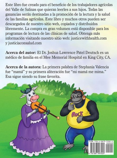 Un libro de abecedario lleno de animales y aliteraciones. Abeja y avispa asustan a ardilla en árbol. Burro bailarín busca bananas en el bosque. Las imágenes son chistosos y interesantes para niños y adultos. Las aliteraciones son útiles para desarrollar la conciencia fonémica en lectores jovenes. Los niños querrán leer este libro una y otra vez. Todas las ganancias se destinarán a la promoción de la lectura y la salud de las familias de trabajadores agrícolas. Descargue este libro gratis en justicewithhealth.com A Spanish alphabet book full of animals and alliterations. Alligator aims apple at airplane. Bear buys big bag of black beans. The pictures are entertaining for children and adults. The alliterations are useful for developing phonemic awareness in early readers and future readers. Children will want to read this book again and again. There's no other alphabet book quite like it. All profits will be donated towards reading and health promotion for farmworker families. Download this book for free at justicewithhealth.com