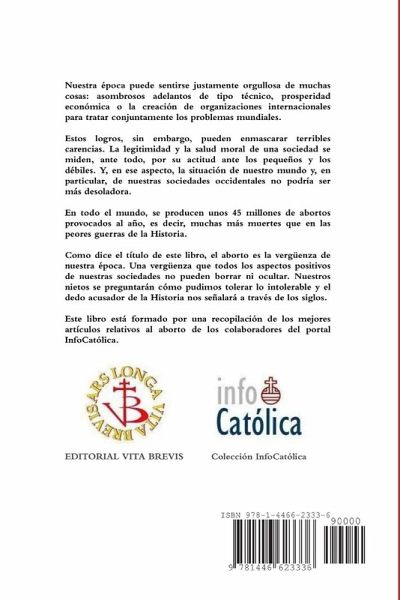 Nuestra época puede sentirse justamente orgullosa de muchas cosas: asombrosos adelantos de tipo técnico, prosperidad económica o la creación de organizaciones internacionales para tratar conjuntamente los problemas mundiales. Estos logros, sin embargo, pueden enmascarar terribles carencias. La legitimidad y la salud moral de una sociedad se miden, ante todo, por su actitud ante los pequeños y los débiles. Y, en ese aspecto, la situación de nuestro mundo y, en particular, de nuestras sociedades occidentales no podría ser más desoladora. En todo el mundo, se producen unos 45 millones de abortos provocados al año, es decir, muchas más muertes que en las peores guerras de la Historia.