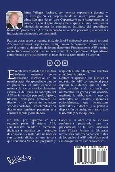 La obra En esta recensión de sus estudios teóricos anteriores sobre educación interactiva en su manifestación de aprendizaje basado en problemas, el autor expone de manera clara y concisa los elementos esenciales del tema. El concepto del ABP en la versión personal, objetivo, filosofía, principios, protocolos de diseño y de aplicación ameritan, cada uno, aparatados específicos. Estructurados tipo diccionario temático permiten una consulta rápida y orientadora. No falta, por supuesto, en una segunda parte, El sistema ABP, con maestro creador o recreador, didáctica interactiva con protocolo de aplicación, y materiales no lineales con soporte digital, ni una tercera que denomina Varia con preguntas y respuestas, una bibliografía selectiva y un glosario básico. Destaca el apartado que justifica el rediseño del ABP convencional para superar la didáctica que el autor llama de salón y de ocurrencia, de un maestro, un grupo y una ocasión, mediante la elaboración y uso de materiales no lineales disponibles editorialmente, que generalizan materiales y didáctica, y la ponen a disposición de cualquier maestro que la necesite y desee aplicarla. Concluye la obra con la incisiva conferencia preparada para la presentación de la Breve Biblioteca Jaime Villegas Pacheco de Educación Interactiva, conformada por seis títulos de los cuales el ABP rediseñado es el estudio que cierra este ciclo teórico.