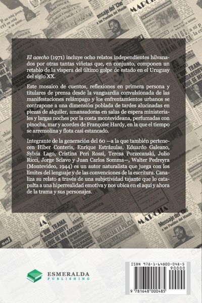 El acecho (1971) incluye ocho relatos independientes hilvanados por otras tantas viñetas que, en conjunto, componen un retablo de la víspera del último golpe de estado en el Uruguay del siglo XX. Este mosaico de cuentos, reflexiones en primera persona y titulares de prensa desde la vanguardia convulsionada de las manifestaciones relámpago y los enfrentamientos urbanos se contrapone a una dimensión poblada de tardes alucinadas en piezas de alquiler, amansadoras en salas de espera ministeriales y largas noches por la costa montevideana, perfumadas con pinocha, mar y acordes de Françoise Hardy, en la que el tiempo se arremolina y flota casi estancado. Integrante de la generación del 60 -a la que también pertenecen Hiber Conteris, Enrique Estrázulas, Eduardo Galeano, Sylvia Lago, Cristina Peri Rossi, Teresa Porzecanski, Julio Ricci, Jorge Sclavo y Juan Carlos Somma-, Walter Pedreyra (Montevideo, 1944) es un autor naturalista que juega con los límites del lenguaje y de las convenciones de la escritura. Canaliza su relato a través de una subjetividad tajante que lo catapulta a una hiperrealidad emotiva y nos ubica en el aquí y ahora de la trama y sus personajes. El acecho includes eight short stories woven together by an equal number of vignettes, sketching a panoramic view of Uruguay on the verge of its last coup d'état in the 20th century. Born in Montevideo, Uruguay, in 1944, Walter Pedreyra is a member of the Generation of 1960.