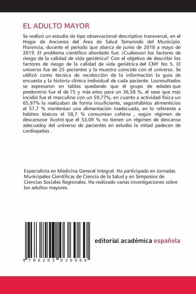Se realizó un estudio de tipo observacional descriptivo transversal, en el Hogar de Ancianos del Área de Salud Tamarindo del Municipio Florencia, durante el período que abarca de junio de 2018 a mayo de 2019. El problema científico abordado fue: ¿Cuálesson los factores de riesgo de la calidad de vida geriátrica? Con el objetivo de describir los factores de riesgo de la calidad de vida geriátrica del CMF No 5. El universo fue de 25 pacientes y la muestra coincide con el universo. Se utilizó como técnica de recolección de la información la guía de encuesta y la historia clínica individual de cada paciente. Losresultados se expresaron en tablas quedando que el grupo de edades que predominó fue el de 75 y más años para un 36,58 %, el sexo que más incidió fue el masculino con un 59,77%, en cuanto a actividad física un 65,97% la realizaban de forma insuficiente, segúnhábitos alimenticios el 57,7 % mantenían una alimentación inadecuada, en lo referente a hábitos tóxicos el 58,7 % consumían cafeína , según régimen de descansose ilustró que el 53,09 % no tienen un régimen de descanso adecuadoy del universo de pacientes en estudio la mitad padecen de cardiopatías .