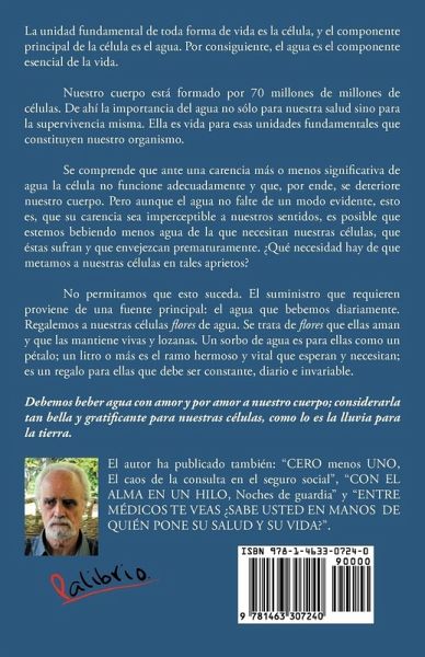 La unidad fundamental de toda forma de vida es la célula, y el componente principal de la célula es el agua. Por consiguiente, el agua es el componente esencial de la vida. Nuestro cuerpo está formado por 70 millones de millones de células. De ahí la importancia del agua no sólo para nuestra salud sino para la supervivencia misma. Ella es vida para esas unidades fundamentales que constituyen nuestro organismo. Se comprende que ante una carencia más o menos significativa de agua la célula no funcione adecuadamente y que, por ende, se deteriore nuestro cuerpo. Pero aunque el agua no falte de un modo evidente, esto es, que su carencia sea imperceptible a nuestros sentidos, es posible que estemos bebiendo menos agua de la que necesitan nuestras células, que éstas sufran y que envejezcan prematuramente. ¿Qué necesidad hay de que metamos a nuestras células en tales aprietos? No permitamos que esto suceda. El suministro que requieren proviene de una fuente principal: el agua que bebemos diariamente. Regalemos a nuestras células flores de agua. Se trata de flores que ellas aman y que las mantiene vivas y lozanas. Un sorbo de agua es para ellas como un pétalo; un litro o más es el ramo hermoso y vital que esperan y necesitan; es un regalo para ellas que debe ser constante, diario e invariable. Debemos beber agua con amor y por amor a nuestro cuerpo; considerarla tan bella y gratificante para nuestras células, como lo es la lluvia para la tierra.