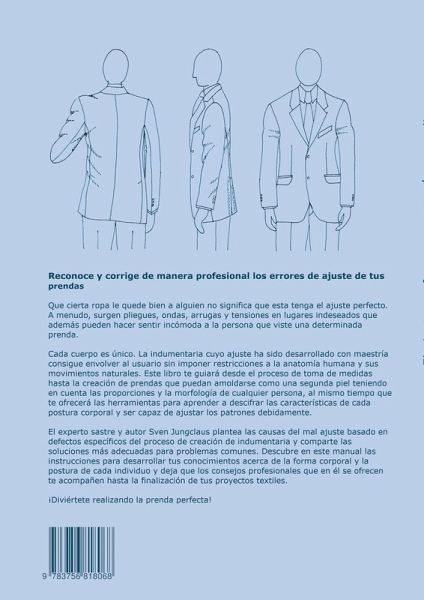 Reconoce y corrige de manera profesional los errores de ajuste de tus prendas Que cierta ropa le quede bien a alguien no significa que esta tenga el ajuste perfecto. A menudo, surgen pliegues, ondas, arrugas y tensiones en lugares indeseados que además pueden hacer sentir incómoda a la persona que viste una determinada prenda. Cada cuerpo es único. La indumentaria cuyo ajuste ha sido desarrollado con maestría consigue envolver al usuario sin imponer restricciones a la anatomía humana y sus movimientos naturales. Este libro te guiará desde el proceso de toma de medidas hasta la creación de prendas que puedan amoldarse como una segunda piel teniendo en cuenta las proporciones y la morfología de cualquier persona, al mismo tiempo que te ofrecerá las herramientas para aprender a descifrar las características de cada postura corporal y ser capaz de ajustar los patrones debidamente. El experto sastre y autor Sven Jungclaus plantea las causas del mal ajuste basado en defectos específicos del proceso de creación de indumentaria y comparte las soluciones más adecuadas para problemas comunes. Descubre en este manual las instrucciones para desarrollar tus conocimientos acerca de la forma corporal y la postura de cada individuo y deja que los consejos profesionales que en él se ofrecen te acompañen hasta la finalización de tus proyectos textiles. ¡Diviértete realizando la prenda perfecta!