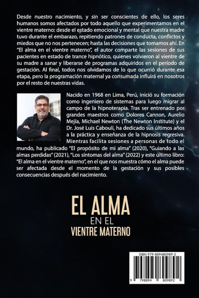 Desde nuestro nacimiento, y sin ser conscientes de ello, los seres humanos somos afectados por todo aquello que experimentamos en el vientre materno: desde el estado emocional y mental que nuestra madre tuvo durante el embarazo, repitiendo patrones de conducta, conflictos y miedos que no nos pertenecen; hasta las decisiones que tomamos ahí. En "El alma en el vientre materno", el autor comparte las sesiones de sus pacientes en estado de trance hipnótico, quienes volvieron al vientre de su madre a sanar y liberarse de programas adquiridos en el período de gestación. Al final, todos nos olvidamos de lo que ocurrió durante esa etapa, pero la programación maternal ya consumada influirá en nosotros por el resto de nuestras vidas. Nacido en 1968 en Lima, Perú, inició su formación como ingeniero de sistemas para luego migrar al campo de la hipnoterapia. Tras ser entrenado por grandes maestros como Dolores Cannon, Aurelio Mejía, Michael Newton (The Newton Institute) y el Dr. José Luis Cabouli, ha dedicado sus últimos años a la práctica y enseñanza de la hipnosis regresiva. Mientras facilita sesiones a personas de todo el mundo, ha publicado "El propósito de mi alma" (2020), "Guiando a las almas perdidas" (2021), "Los síntomas del alma" (2022) y este último libro: "El alma en el vientre materno", en el que nos muestra cómo el alma puede ser afectada desde el momento de la gestación y sus posibles consecuencias después del nacimiento.