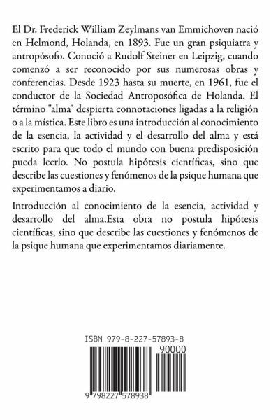 El Dr. Frederick William Zeylmans van Emmichoven nació en Helmond, Holanda, en 1893. Fue un gran psiquiatra y antropósofo. Conoció a Rudolf Steiner en Leipzig, cuando comenzó a ser reconocido por sus numerosas obras y conferencias. Desde 1923 hasta su muerte, en 1961, fue el conductor de la Sociedad Antroposófica de Holanda. El término "alma" despierta connotaciones ligadas a la religión o a la mística. Este libro es una introducción al conocimiento de la esencia, la actividad y el desarrollo del alma y está escrito para que todo el mundo con buena predisposición pueda leerlo. No postula hipótesis científicas, sino que describe las cuestiones y fenómenos de la psique humana que experimentamos a diario. Introducción al conocimiento de la esencia, actividad y desarrollo del alma.Esta obra no postula hipótesis científicas, sino que describe las cuestiones y fenómenos de la psique humana que experimentamos diariamente.