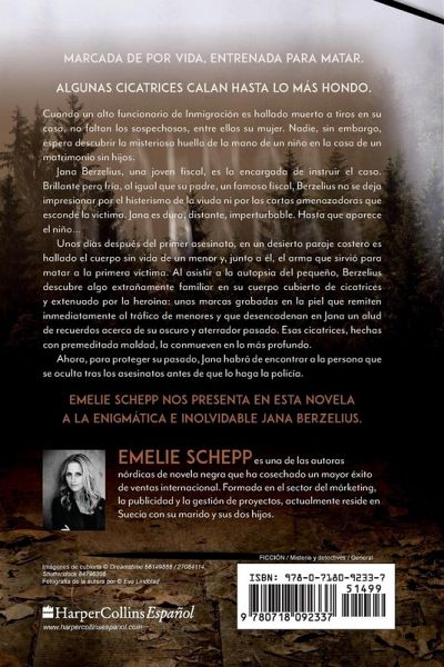""Schepp te atrapa desde la primera p¿¿gina y ya no te suelta. Te introduce paulatinamente en una oscuridad casi insoportable, en la que la maldad humana se revela capa tras capa. Un debut impresionante."" Cilla y Rolf B¿¿rjlind Marcada de por vida, entrenada para matar. Algunas cicatrices calan hasta lo m¿¿s hondo. Cuando un alto funcionario de Inmigraci¿¿n es hallado muerto a tiros en su casa, no faltan los sospechosos, entre ellos su mujer. Nadie, sin embargo, espera descubrir la misteriosa huella de la mano de un ni¿¿o en la casa de un matrimonio sin hijos. Jana Berzelius, una joven fiscal, es la encargada de instruir el caso. Brillante pero fr¿¿a, al igual que su padre, un famoso fiscal, Berzelius no se deja impresionar por el histerismo de la viuda ni por las cartas amenazadoras que esconde la v¿¿ctima. Jana es dura, distante, imperturbable. Hasta que aparece el ni¿¿o... Unos d¿¿as despu¿¿s del primer asesinato, en un desierto paraje costero es hallado el cuerpo sin vida de un menor y, junto a ¿¿l, el arma que sirvi¿¿ para matar a la primera v¿¿ctima. Al asistir a la autopsia del peque¿¿o, Berzelius descubre algo exträ¿amente familiar en su cuerpo cubierto de cicatrices y extenuado por la hero¿¿na: unas marcas grabadas en la piel que remiten inmediatamente al tr¿¿fico de menores y que desencadenan en Jana un alud de recuerdos acerca de su oscuro y aterrador pasado. Esas cicatrices, hechas con premeditada maldad, la conmueven en lo m¿¿s profundo. Ahora, para proteger su pasado, Jana habr¿¿ de encontrar a la persona que se oculta tras los asesinatos antes de que lo haga la polic¿¿a. ""Una novela de lectura vertiginosa."" TV4 ""Esta primera novela cautiva al lector desde el primer momento. Es imposible soltarla."" Detective Magazine ""La complejidad argumental de Emelie Schepp es digna de un Nesb¿¿ o un Kepler."" Dast Magazine