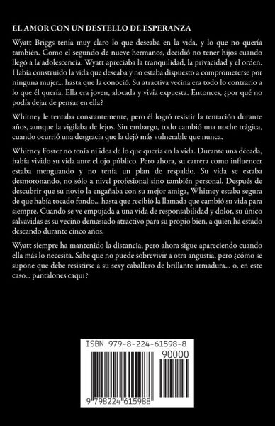 Wyatt Briggs tenía muy claro lo que deseaba en la vida, y lo que no quería también. Como el segundo de nueve hermanos, decidió no tener hijos cuando llegó a la adolescencia. Wyatt apreciaba la tranquilidad, la privacidad y el orden. Había construido la vida que deseaba y no estaba dispuesto a comprometerse por ninguna mujer... hasta que la conoció. Su atractiva vecina era todo lo contrario a lo que él quería. Ella era joven, alocada y vivía expuesta. Entonces, ¿por qué no podía dejar de pensar en ella? Whitney le tentaba constantemente, pero él logró resistir la tentación durante años, aunque la vigilaba de lejos. Sin embargo, todo cambió una noche trágica, cuando ocurrió una desgracia que la dejó más vulnerable que nunca. Whitney Foster no tenía ni idea de lo que quería en la vida. Durante una década, había vivido su vida ante el ojo público. Pero ahora, su carrera como influencer estaba menguando y no tenía un plan de respaldo. Su vida se estaba desmoronando, no sólo a nivel profesional sino también personal. Después de descubrir que su novio la engañaba con su mejor amiga, Whitney estaba segura de que había tocado fondo... hasta que recibió la llamada que cambió su vida para siempre. Cuando se ve empujada a una vida de responsabilidad y dolor, su único salvavidas es su vecino demasiado atractivo para su propio bien, a quien ha estado deseando durante cinco años. Wyatt siempre ha mantenido la distancia, pero ahora sigue apareciendo cuando ella más lo necesita. Sabe que no puede sobrevivir a otra angustia, pero ¿cómo se supone que debe resistirse a su sexy caballero de brillante armadura... o, en este caso... pantalones caqui?