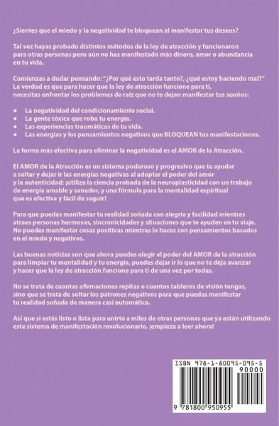 ¿Sientes que el miedo y la negatividad te bloquean al manifestar tus deseos? Tal vez hayas probado distintos métodos de la ley de atracción y funcionaron para otras personas pero aún no has manifestado más dinero, amor o abundancia en tu vida. Comienzas a dudar pensando: "¿Por qué esto tarda tanto?, ¿qué estoy haciendo mal?" La verdad es que para hacer que la ley de atracción funcione para ti, necesitas enfrentar los problemas de raíz que no te dejan manifestar tus sueños: ¿ La negatividad del condicionamiento social. ¿ La gente tóxica que roba tu energía. ¿ Las experiencias traumáticas de tu vida. ¿ Las energías y los pensamientos negativos que BLOQUEAN tus manifestaciones. La forma más efectiva para eliminar la negatividad es el AMOR de la Atracción. El AMOR de la Atracción es un sistema poderoso y progresivo que te ayudar a soltar y dejar ir las energías negativas al adoptar el poder del amor y la autenticidad; ¡utiliza la ciencia probada de la neuroplasticidad con un trabajo de energía amable y sanador, y una fórmula para la mentalidad espiritual que es efectiva y fácil de seguir! Para que puedas manifestar tu realidad soñada con alegría y facilidad mientras atraes personas hermosas, sincronicidades y situaciones que te ayuden en tu viaje. No puedes manifestar cosas positivas mientras lo haces con pensamientos basados en el miedo y negativos. Las buenas noticias son que ahora puedes elegir el poder del AMOR de la atracción para limpiar tu mentalidad y tu energía, puedes dejar ir lo que no te deja avanzar y hacer que la ley de atracción funcione para ti de una vez por todas. No se trata de cuantas afirmaciones repitas o cuantos tableros de visión tengas, sino que se trata de soltar los patrones negativos para que puedas manifestar tu realidad soñada de manera casi automática. Así que si estás listo o lista para unirte a miles de otras personas que ya están utilizando este sistema de manifestación revolucionario, ¡desplázate hacia la parte de arriba de la página y asegura una copia ahora!
