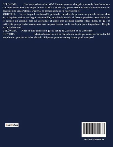 GERÓNIMA: ¿Hay huésped más descortés? ¡Un mes en casa, al regalo y mesa de don Gonzalo, y sin saber en un mes que mujer en ella habita, o si lo sabe, que es llano, blasonar de cortesano y no hacerme una visita? ¡Jesús, Quiteria, es grosero aunque tú vuelvas por él! QUITERIA: Yo, en lo que he notado dél, perfeto le considero: la persona, un pino de oro; un alma en cualquiera acción; de alegre conversación, guardando en ella el decoro que debe a su calidad; en lo curioso un armiño, mas no afectando el aliño que afemina nuestra edad; mozo, lo que es suficiente para prendar hermosuras mas no para travesuras de edad, por poca, imprudente. Júzgole yo de treinta años. GERÓNIMA: Pinta en él la perfección que el conde de Castellón en su Cortesano. QUITERIA: Extraños humores en ti ha causado ese enojo que condeno. Ya no tendrá nada bueno, porque no te ha visitado. Si ignora que en casa hay dama, ¿qué le culpas?