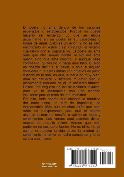 Todo poema que alcance la temática del amor tiene un aire de imposible, de inalcanzable. Más aún, muchos dirán que este matiz es indispensable para que el poema alcance la máxima tensión o vaivén de ideas y sentimientos. Los versos aquí escritos distan mucho de aquella visión. Versos que bien pudieron no ser, pero fueron. No es idilio, no es calma, ni atalayar la vida desde la quietud del sentimiento, el amor es lucha constante, y lo es contra uno mismo.