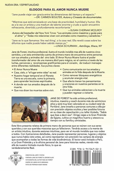 Jane de Forest, intuitiva profesional, ilustra el mundo invisible mas allá de nuestros cinco sentidos, y en esta entretenida cuenta de primera mano de encuentros entre personas con sus amados y animales del otro lado. El Amor Nunca Muere ilustra el poder transformador del amor de una manera dócil pero mágica, en el camino a través de las luchas, percances y recompensas gratificantes para el corazón, de traducir mensajes entre diferentes realidades. Sus puntos claves: • El Amor Nunca Muere • Casa, cielo, o "el lugar entre vidas" es real. • Nuestro hogar temporal en el Planeta Tierra es una escuela, como la primaria, para aprender lecciones espirituales. • A donde van tus amados después de la muerte. • Que nos dicen los muertos sobre vivir. • Como comunicarte con tus amados y animales en la Vida después de la Muerte. • Como remover bloqueos energéticos y acumular energía vital. • Que efecto tienen los pensamientos y oraciones en nuestros parientes en la otra Vida. • Que tus animales sobreviven a la muerte y pueden regresar a visitarte. Este libro presenta relatos de primera mano de personas que se reúnen con sus seres queridos y con sus queridas mascotas que ya fallecieron. Tendrás acceso a la mente de un artista intuitiva, durante sesiones intuitivas, para ver el mundo invisible que nos rodea a todos. Con ilustraciones detalladas, Jane puede representar personas, lugares y objetos que nunca había visto antes, así como representar con precisión los campos de energía que acompañan todas las formas de vida biodinámicas. El lector está invitado a Perú, a La Gran Pirámide y a la oficina personal de Jane para historias reales, viendo más allá de nuestro limitado mundo físico, lo que es verdaderamente Real. ELOGOIS PARA EL AMOR NUNCA MUERE "Jane puede viajar con gracia entre las dimensiones del tiempo y el espacio." -DR. CARMEN BOULTER, Autora y Cineasta de documentales. "Mientras que está enraizada en una base de practicidad, humildad y humor. Ella es a la vez un artista y una medium de talento enorme y crudo a quien encuentro refrescante, divertida y profundamente reconfortante." -SUSAN CHERNAK MCELROY Autora del bestseller del New York Times "Los animales como maestros y guías para el alma" y "Todas mis relaciones viven con animales como maestros y sanadores." "Jane es lo que llamamos 'the real thing', o la cosa real. Ella reveló cosas sobre los difuntos que nadie puede haber sabido menos yo." -LINDA SCHURMAN , Astróloga, Ithaca, NY
