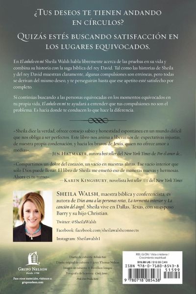 La autora best seller y maestra b¿¿blica Sheila Walsh revela los anhelos m¿¿s profundos del coraz¿¿n de una mujer y alienta a los lectores a descubrir la incansable b¿¿squeda de Dios a trav¿¿s de esos mismos anhelos. Sheila Walsh ha escrito su libro m¿¿s personal hasta ahora, usando una de las experiencias m¿¿s dolorosas de su vida como el terreno para predicar una sencilla verdad: pese a lo que nos empuje a los mismos viejos patrones y errores, Dios es lo que anhelamos. No hay necesidad de mirar en ning¿¿n otro lugar. Trazando profundos paralelismos de la vida del rey David, Walsh describe una vida gastada llenando con todas las cosas equivocadas un vac¿¿o con forma de Dios. Una y otra vez. Desde el pin¿¿culo de la escena de la m¿¿sica cristiana hasta una asombrosa carrera como escritora y conferencista, Sheila Walsh ha tocado las vidas de incontables mujeres que buscan abrigo, consuelo y seguridad en los brazos del Se¿¿or. Esta es la historia de c¿¿mo Sheila entendi¿¿ qü¿ era lo que siempre hab¿¿a anhelado, y una invitaci¿¿n a que t¿¿ descubras lo mismo. Bestselling author and Bible teacher Sheila Walsh unpacks the deepest longings of a woman's heart and encourages readers to discover God's relentless pursuit of them through those very longings. Sheila Walsh has written her most personal book yet, using one of the most painful experiences of her life as ground for preaching a simple truth: No matter what is drawing you into the same old patterns and mistakes, God is what you long for. There's no need to look anywhere else. Drawing profound parallels from the life of King David, Walsh describes a life spent filling a God-shaped void with all the wrong things. Over and over again. From the pinnacle of the Christian music scene to a breathtaking career as a writer and speaker, Sheila Walsh has touched the lives of countless women looking for shelter, comfort, and safety in the arms of the Lord. The Longing in Me is the story of how Sheila realized what it was she had always longed for--and an invitation for you to discover the same.