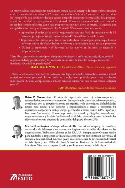 Logra en 12 semanas lo que otros hacen en 12 meses. La mayoría de las organizaciones e individuos trabaja bajo el concepto de metas y planes anuales; es decir, en ciclos de ejecución de 12 meses. En cambio, El año de 12 semanas te propone evitar las trampas y la baja productividad que genera el tipo de pensamiento anualizado. Esta propuesta redefine tu "año" para que pienses en términos de 12 semanas de ejecución durante las cuales no tendrás tiempo suficiente como para posponer tus metas y, por el contrario, tu urgencia por cumplirlas aumentará y se intensificará. En El año de 12 semanas aprenderás cómo:Aprovechar el poder de las metas programadas con una fecha de vencimiento de 12 semanas para que obtengas mejores resultados en cualquier área de tu vida. Implementar las instrucciones tanto para individuos como organizaciones que buscan mejorar el nivel de efectividad en lo referente a la ejecución de sus metas y proyectos. Utilizar la experiencia y el liderazgo de sus autores en las áreas de ejecución e implementación.