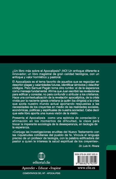 Esta obra novedosa e in¿¿dita, contiene una interpretaci¿¿n desde la perspectiva teol¿¿gica e hist¿¿rica del libro m¿¿s enigm¿¿tico de la Biblia: el Apocalipsis. El autor aborda textos b¿¿blicos desde preguntas existenciales de nuestra ¿¿poca, con un enfoque esperanzador y un mensaje de consolaci¿¿n que brindar¿¿ una experiencia de lectura clara y alentadora. El deseo expreso de su autor es ayudar a pastores y predicadores a comprender mejor el mensaje transformador del vidente Juan, y compartirlo en sus sermones y estudios. El autor con esta aportaci¿¿n magistral conjunta los v¿¿nculos de Apocalipsis con el resto de la literatura apocal¿¿ptica: la B¿¿blica, la deuterocan¿¿nica, y la ap¿¿crifa; Y los engarces con la literatura prof¿¿tica, sapiencial, y los himnos lit¿¿rgicos del Antiguo y Nuevo Testamento. Incluye: Contenido Apocal¿¿ptico. Amplia introducci¿¿n para explicar contexto. Interpretaci¿¿n por Samuel Pag¿¿n. La esperanza como enfoque fundamental. Revelation This wonderful work contains an interpretation from the theological and historical perspective of the most enigmatic book in the Bible: the book of Revelation. The author approaches biblical texts from existential questions of our time, with a hopeful approach and a message of consolation that will provide a clear and encouraging reading experience. The express desire of its author is to help pastors and preachers better understand the transformative message of the Apostle John, and share it in their sermons and studies. The author with this masterful contribution links the book of Revelation with the rest of the apocalyptic literature: the Biblical, the deuterocanonical, and the apocryphal; And it links them with prophetic, wisdom, and liturgical hymns from the Old and New Testaments. This book includes: Apocalyptic content. Extensive introduction to explain context. Interpretation by Samuel Pag¿¿n. Hope as a fundamental focus.