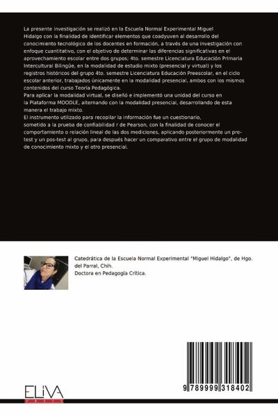 La presente investigación se realizó en la Escuela Normal Experimental Miguel Hidalgo con la finalidad de identificar elementos que coadyuven al desarrollo del conocimiento tecnológico de los docentes en formación, a través de una investigación con enfoque cuantitativo, con el objetivo de determinar las diferencias significativas en el aprovechamiento escolar entre dos grupos; 4to. semestre Licenciatura Educación Primaria Intercultural Bilingüe, en la modalidad de estudio mixto (presencial y virtual) y los registros históricos del grupo 4to. semestre Licenciatura Educación Preescolar, en el ciclo escolar anterior, trabajados únicamente en la modalidad presencial, ambos con los mismos contenidos del curso Teoría Pedagógica. Para aplicar la modalidad virtual, se diseñó e implementó una unidad del curso en la Plataforma MOODLE, alternando con la modalidad presencial, desarrollando de esta manera el trabajo mixto. El instrumento utilizado para recopilar la información fue un cuestionario, sometido a la prueba de confiabilidad r de Pearson, con la finalidad de conocer el comportamiento o relación lineal de las dos mediciones, aplicando posteriormente un pre- test y un pos-test al grupo, para después hacer un comparativo entre el grupo de modalidad de conocimiento mixto y el otro presencial.
