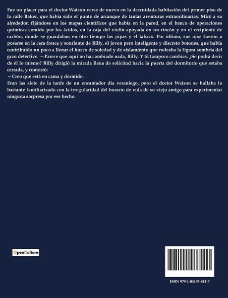 Fue un placer para el doctor Watson verse de nuevo en la descuidada habitación del primer piso de la calle Baker, que había sido el punto de arranque de tantas aventuras extraordinarias. Miró a su alrededor, fijándose en los mapas científicos que había en la pared, en el banco de operaciones químicas comido por los ácidos, en la caja del violín apoyada en un rincón y en el recipiente de carbón, donde se guardaban en otro tiempo las pipas y el tabaco. Por último, sus ojos fueron a posarse en la cara fresca y sonriente de Billy, el joven pero inteligente y discreto botones, que había contribuido un poco a llenar el hueco de soledad y de aislamiento que rodeaba la figura sombría del gran detective. ¿Parece que aquí no ha cambiado nada, Billy. Y tú tampoco cambias. ¿Se podrá decir de él lo mismo? Billy dirigió la mirada llena de solicitud hacia la puerta del dormitorio que estaba cerrada, y contestó: ¿Creo que está en cama y dormido. Eran las siete de la tarde de un encantador día veraniego, pero el doctor Watson se hallaba lo bastante familiarizado con la irregularidad del horario de vida de su viejo amigo para experimentar ninguna sorpresa por ese hecho.