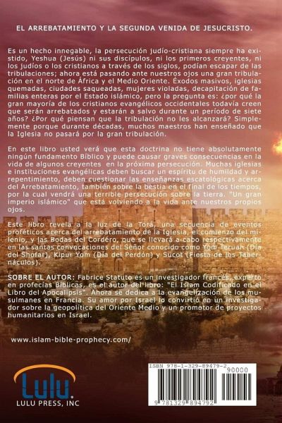 Es un hecho innegable la persecución judío-cristiana siempre ha existido; Yeshua ni sus discípulos ni los primeros creyentes, ni los judíos o los cristianos a través de los siglos podían escapar de las tribulaciones. Ahora está pasando ante nuestros ojos una gran tribulación en el norte de África y el Medio Oriente: Éxodos masivos, iglesias quemadas, ciudades saqueadas, mujeres violadas, decapitación de familias enteras por el Estado islámico. Pero la pregunta es ¿por qué la gran mayoría de los cristianos evangélicos occidentales todavía creen que serán arrebatados y estarán a salvo durante un período de siete años? Y piensan que la tribulación no les alcanzara. Este libro revela a la luz de la Torá, una secuencia de eventos proféticos acerca del arrebatamiento de la Iglesia, el comienzo del milenio, y las Bodas del Cordero, que se llevará a cabo respectivamente en las santas convocaciones del Señor conocido como Yom Teruah (Día del Shofar) Kipur Yom (Día del Perdón) y Sucot (Fiesta de los Tabernáculos).