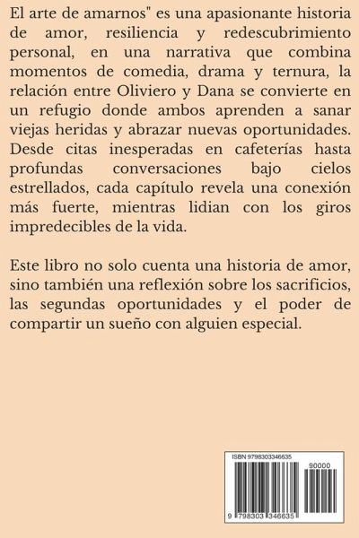 El arte de amarnos" es una apasionante historia de amor, resiliencia y redescubrimiento personal, en una narrativa que combina momentos de comedia, drama y ternura, la relación entre Oliviero y Dana se convierte en un refugio donde ambos aprenden a sanar viejas heridas y abrazar nuevas oportunidades. Desde citas inesperadas en cafeterías hasta profundas conversaciones bajo cielos estrellados, cada capítulo revela una conexión más fuerte, mientras lidian con los giros impredecibles de la vida. Este libro no solo cuenta una historia de amor, sino también una reflexión sobre los sacrificios, las segundas oportunidades y el poder de compartir un sueño con alguien especial.