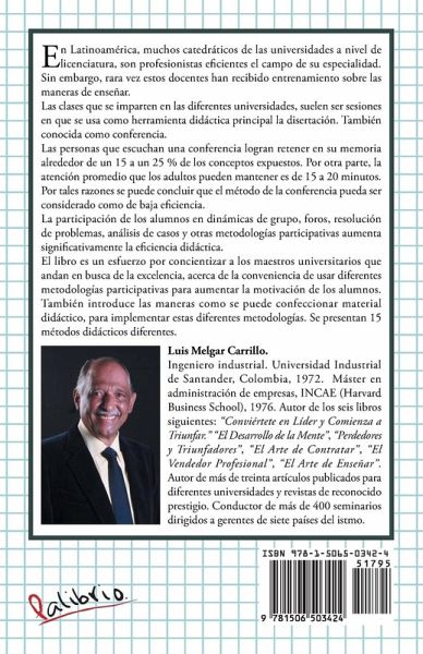 En Latinoamérica, muchos catedráticos de las universidades a nivel de licenciatura, son profesionistas eficientes en el campo de su especialidad. Sin embargo, rara vez estos docentes han recibido entrenamiento sobre las maneras de enseñar. Las clases que se imparten en las diferentes universidades, suelen ser sesiones en que se usa como herramienta didáctica principal la disertación. También conocida como conferencia. Las personas que escuchan una conferencia logran retener en su memoria alrededor de un 15 a un 25 % de los conceptos expuestos. Por otra parte, la atención promedio que los adultos pueden mantener es de 15 a 20 minutos. Por tales razones se puede concluir que el método de la conferencia pueda ser considerado como de baja eficiencia. La participación de los alumnos en dinámicas de grupo, foros, resolución de problemas, análisis de casos y otras metodologías participativas aumenta significativamente la eficiencia didáctica. El libro es un esfuerzo por concientizar a los maestros universitarios que andan en busca de la excelencia, acerca de la conveniencia de usar diferentes metodologías participativas para aumentar la motivación de los alumnos. También introduce las maneras como se puede confeccionar material didáctico, para implementar estas diferentes metodologías. Se presentan 15 métodos didácticos diferentes.