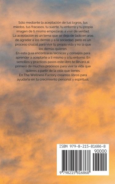 ¿Estás preparado para abrazar tu verdadero yo, amarte incondicionalmente y vivir cada momento al máximo? En este inspirador libro, descubrirás técnicas probadas y ejercicios prácticos que te ayudarán a cultivar una profunda conexión contigo mismo. A través de esta guía, aprenderás a: Dejar de lado la autocrítica y el juicio y, en su lugar, te embarcarás en un viaje de autodescubrimiento, aceptación y amor propio. Explorar tus fortalezas, debilidades y pasiones para abrazar tu autenticidad y vivir en armonía con quien realmente eres. Hacer a un lado las expectativas externas y a aceptar tus imperfecciones como parte de tu belleza única. Descubrir cómo transformar la autocrítica en autocompasión y amor incondicional. Abrazar el poder del ahora y deja ir el pasado y las preocupaciones del futuro. Saborear cada momento y a encontrar alegría y gratitud en las pequeñas cosas de la vida. Este libro es una experiencia transformadora que te guiará hacia una vida llena de amor propio, aceptación y felicidad. No importa en qué etapa de tu viaje personal te encuentres, esta guía te dará las herramientas que necesitas para aprender a quererte a ti mismo y vivir la vida al máximo. ¿Estás listo para abrazar el arte de la aceptación y comenzar tu viaje hacia una vida más plena y significativa? Adquiere ya tu ejemplar de El Arte de la Aceptación y ¡empieza a quererte en cada página! En The Wellness Factory creamos libros para ayudarte en tu crecimiento personal y espiritual.