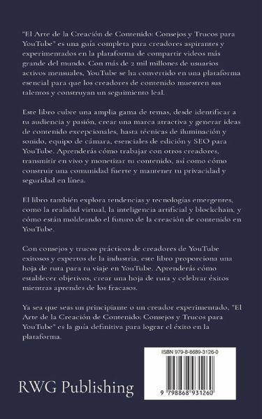"El Arte de la Creación de Contenido: Consejos y Trucos para YouTube" es una guía completa para creadores aspirantes y experimentados en la plataforma de compartir videos más grande del mundo. Con más de 2 mil millones de usuarios activos mensuales, YouTube se ha convertido en una plataforma esencial para que los creadores de contenido muestren sus talentos y construyan un seguimiento leal. Este libro cubre una amplia gama de temas, desde identificar a tu audiencia y pasión, crear una marca atractiva y generar ideas de contenido excepcionales, hasta técnicas de iluminación y sonido, equipo de cámara, esenciales de edición y SEO para YouTube. Aprenderás cómo trabajar con otros creadores, transmitir en vivo y monetizar tu contenido, así como cómo construir una comunidad fuerte y mantener tu privacidad y seguridad en línea. El libro también explora tendencias y tecnologías emergentes, como la realidad virtual, la inteligencia artificial y blockchain, y cómo están moldeando el futuro de la creación de contenido en YouTube. Con consejos y trucos prácticos de creadores de YouTube exitosos y expertos de la industria, este libro proporciona una hoja de ruta para tu viaje en YouTube. Aprenderás cómo establecer objetivos, crear una hoja de ruta y celebrar éxitos mientras aprendes de los fracasos. Ya sea que seas un principiante o un creador experimentado, "El Arte de la Creación de Contenido: Consejos y Trucos para YouTube" es la guía definitiva para lograr el éxito en la plataforma.
