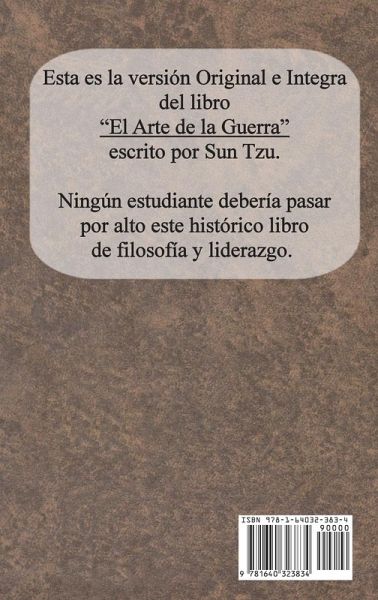 Esta es la versión Original e Integra del libro "El Arte de la Guerra" escrito por Sun Tzu con una nueva traducción de Carlos Gil, el cual ofrecemos aquí por un costo económico. Este libro clásico enfocado en los pensamientos describe como cada uno de nosotros da forma a nuestras circunstancias. Tal como el mismo Tzu describe, "Los buenos luchadores de antaño primero aseguraban su posición para evitar una derrota y luego esperaban una oportunidad para derrotar al enemigo." Ningún estudiante debería pasar por alto este histórico libro de filosofía y liderazgo. Esta edición brinda un libro delgado con el texto completo a un precio asequible. CONTENIDO I. PREPARACIÓN DE PLANES 3 II. LIBRANDO LA GUERRA 4 III. ATAQUE POR ESTRATAGEMAS 6 IV. DISPOSICIONES TÁCTICAS 9 V. ENERGÍA 10 VI. PUNTOS FUERTES Y DÉBILES 13 VII. MANIOBRAS 15 VIII. VARIACIÓN EN LAS TÁCTICAS 17 IX. EL EJÉRCITO EN MOVIMIENTO 19 X. TERRENO 22 XI. LAS NUEVE SITUACIONES 26 XII. ATAQUE POR FUEGO 32 XIII. EL USO DE ESPÍAS 33