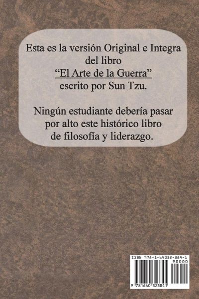 Esta es la versión Original e Integra del libro "El Arte de la Guerra" escrito por Sun Tzu con una nueva traducción de Carlos Gil, el cual ofrecemos aquí por un costo económico. Este libro clásico enfocado en los pensamientos describe como cada uno de nosotros da forma a nuestras circunstancias. Tal como el mismo Tzu describe, "Los buenos luchadores de antaño primero aseguraban su posición para evitar una derrota y luego esperaban una oportunidad para derrotar al enemigo." Ningún estudiante debería pasar por alto este histórico libro de filosofía y liderazgo. Esta edición brinda un libro delgado con el texto completo a un precio asequible. CONTENIDO I. PREPARACIÓN DE PLANES 3 II. LIBRANDO LA GUERRA 4 III. ATAQUE POR ESTRATAGEMAS 6 IV. DISPOSICIONES TÁCTICAS 9 V. ENERGÍA 10 VI. PUNTOS FUERTES Y DÉBILES 13 VII. MANIOBRAS 15 VIII. VARIACIÓN EN LAS TÁCTICAS 17 IX. EL EJÉRCITO EN MOVIMIENTO 19 X. TERRENO 22 XI. LAS NUEVE SITUACIONES 26 XII. ATAQUE POR FUEGO 32 XIII. EL USO DE ESPÍAS 33