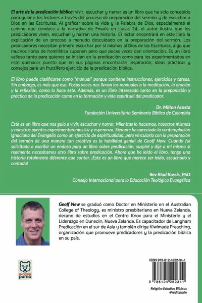 El arte de la predicación bíblica: vivir, escuchar y narrar las Escrituras es un libro concebido para guiar a los lectores a través del proceso de preparación del sermón y de escuchar a Dios en las Escrituras. Al graficar sobre la vida y la Palabra de Dios, especialmente el camino que conduce a la narrativa de Emaús en Lucas 24, el autor ilustra que los predicadores viven, escuchan y narran una historia. El lector encontrará en este libro la explicación de un proceso a menudo descuidado en la preparación del sermón. Los predicadores necesitan primero escuchar por sí mismos al Dios de las Escrituras, algo que muchos libros de homilética suponen pero que pocas veces dan orientación. Es un libro valioso tanto para quienes se inician en la predicación como para los experimentados en este quehacer puesto que en sus páginas encontrarán inspiración, ideas prácticas y consejos para un fructífero ejercicio de la predicación bíblica.