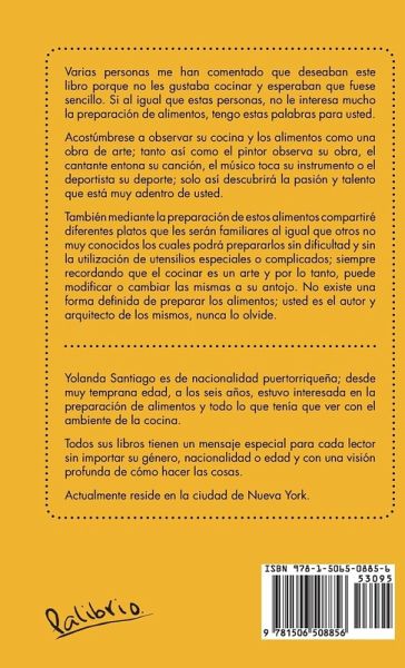 Varias personas me han comentado que deseaban este libro porque no les gustaba cocinar y esperaban que fuese sencillo. Si al igual que estas personas, no le interesa mucho la preparación de alimentos, tengo estas palabras para usted. Acostúmbrese a observar su cocina y los alimentos como una obra de arte; tanto así como el pintor observa su obra, el cantante entona su canción, el músico toca su instrumento o el deportista su deporte; solo así descubrirá la pasión y talento que está muy adentro de usted. También mediante la preparación de estos alimentos compartiré diferentes platos que les serán familiares al igual que otros no muy conocidos los cuales podrá prepararlos sin dificultad y sin la utilización de utensilios especiales o complicados; siempre recordando que el cocinar es un arte y por lo tanto, puede modificar o cambiar las mismas a su antojo. No existe una forma definida de preparar los alimentos; usted es el autor y arquitecto de los mismos, nunca lo olvide.