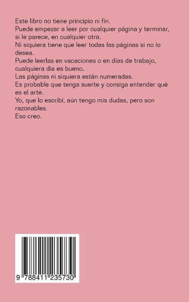 Este libro no tiene principio ni fin. Puede empezar a leer por cualquier página y terminar, si le parece, en cualquier otra. Ni siquiera tiene que leer todas las páginas si no lo desea. Puede leerlas en vacaciones o en días de trabajo, cualquiera día es bueno. Las páginas ni siquiera están numeradas. Es probable que tenga suerte y consiga entender qué es el arte. Yo, que lo escribí, aún tengo mis dudas, pero son razonables. Eso creo.